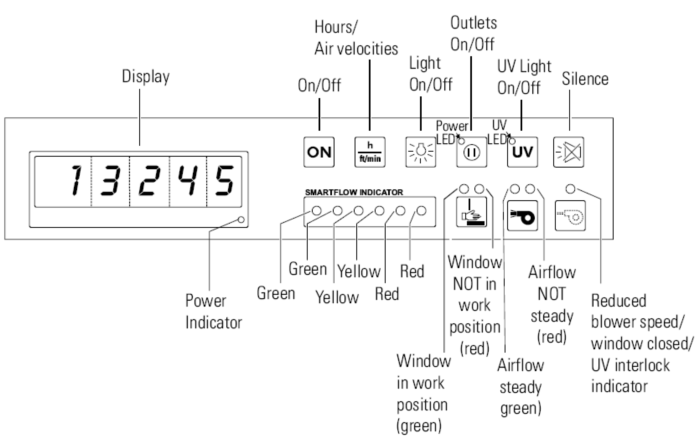 4.2 Hours/Air Velocities (小时/空气速度)键:可在操作时间与安全工作模式(前窗在打开的安全工作位置上)下的下降气流和外排气流速度之间转换。